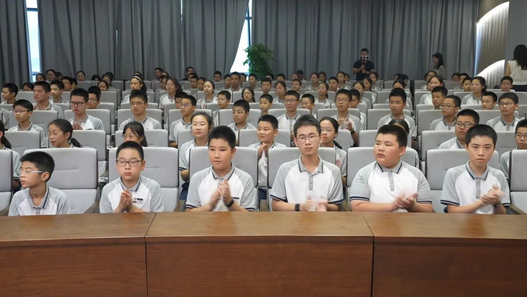 每天工作16小时,年发稿700余篇;策划“不让一个贫困生失学”活动,帮助1.6万名学生重返校园;连续23年操办“慈善大宴”,惠及20多万人;四赴雅安地震灾区,建成“震不垮的温州慈善楼”;远赴非洲抗击埃博拉疫情,建起“温州希望屋”。 她是党的十七大代表、第十二届全国人大代表,曾参与推动温州获得地方立法权。她说:“我要像政治家那样为民代言,像文学家那样书写人性光辉。” 如今,她创办公益道德讲坛千余场,走进高校社区,唤醒人心向善的力量。“下半场人生,我要再健康工作30年,用生命唤醒生命。” 从仰望星光,到成为光源 从仰望星光,到成为光源 四位榜样讲述完毕,南浦中学两位初中生代表走上舞台。七(32)班余越说:“郑老师和王老师的志向不是小目标,而是服务人民、推动国家进步的远大抱负。他们让我明白,立志之后,更要行动。”七(29)班吴睿动情地说:“胡叔叔让我看到每一个微小进步背后的巨大付出,陈叔叔让我懂得什么是真正的工匠精神。你们就是我心中真正‘追光’的人。” 稚嫩的声音里,已有信念萌芽。这场持续三个小时的报告会,没有空洞说教,只有真实人生的淬炼与升华。它打破传统思政课的边界,将社会楷模请进校园,让抽象的价值观变得可感、可触、可学。